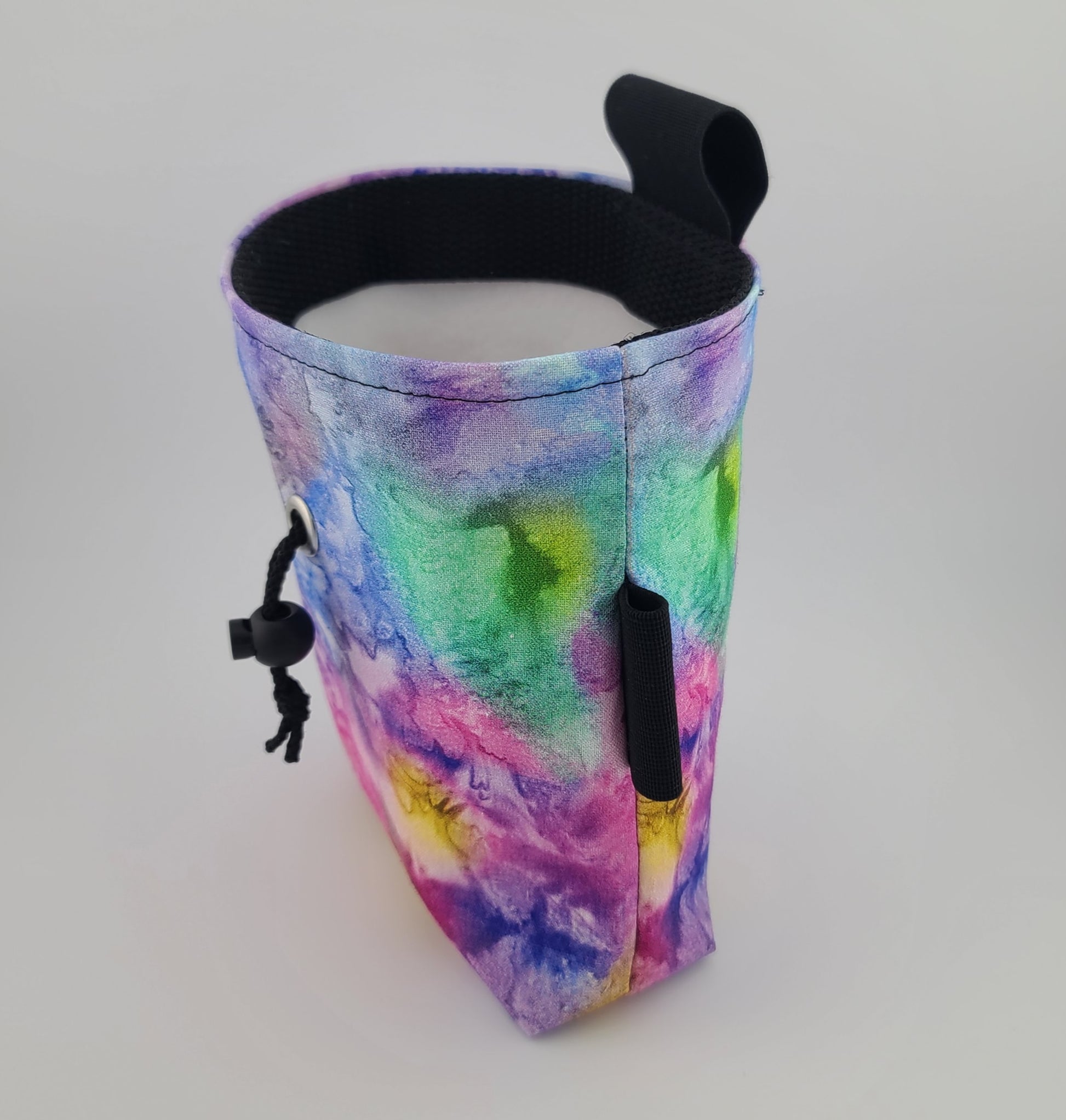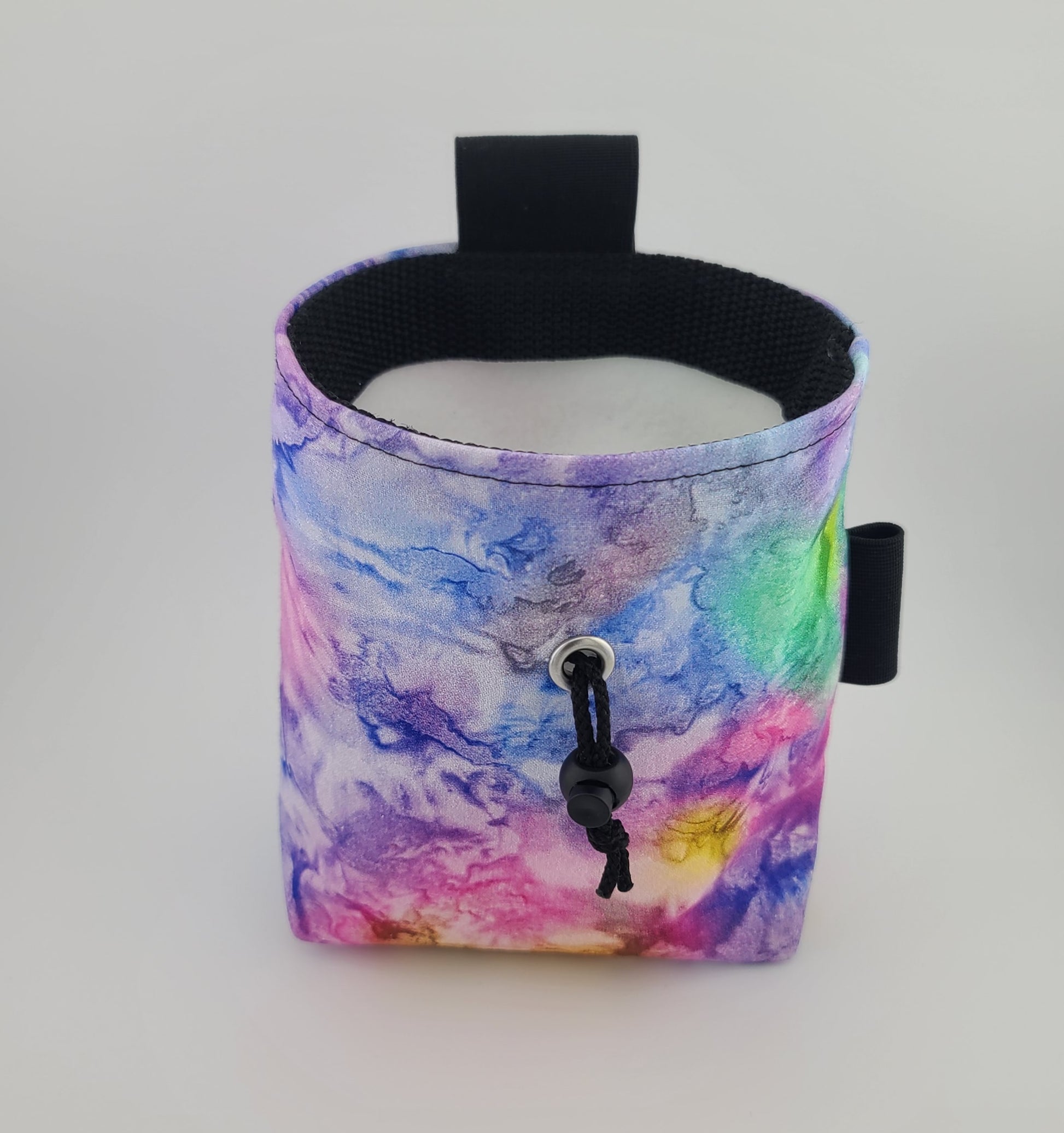 Stand out with this handmade tie dye chalk bag. Lightweight and medium size bag with belt loop and brush holder.